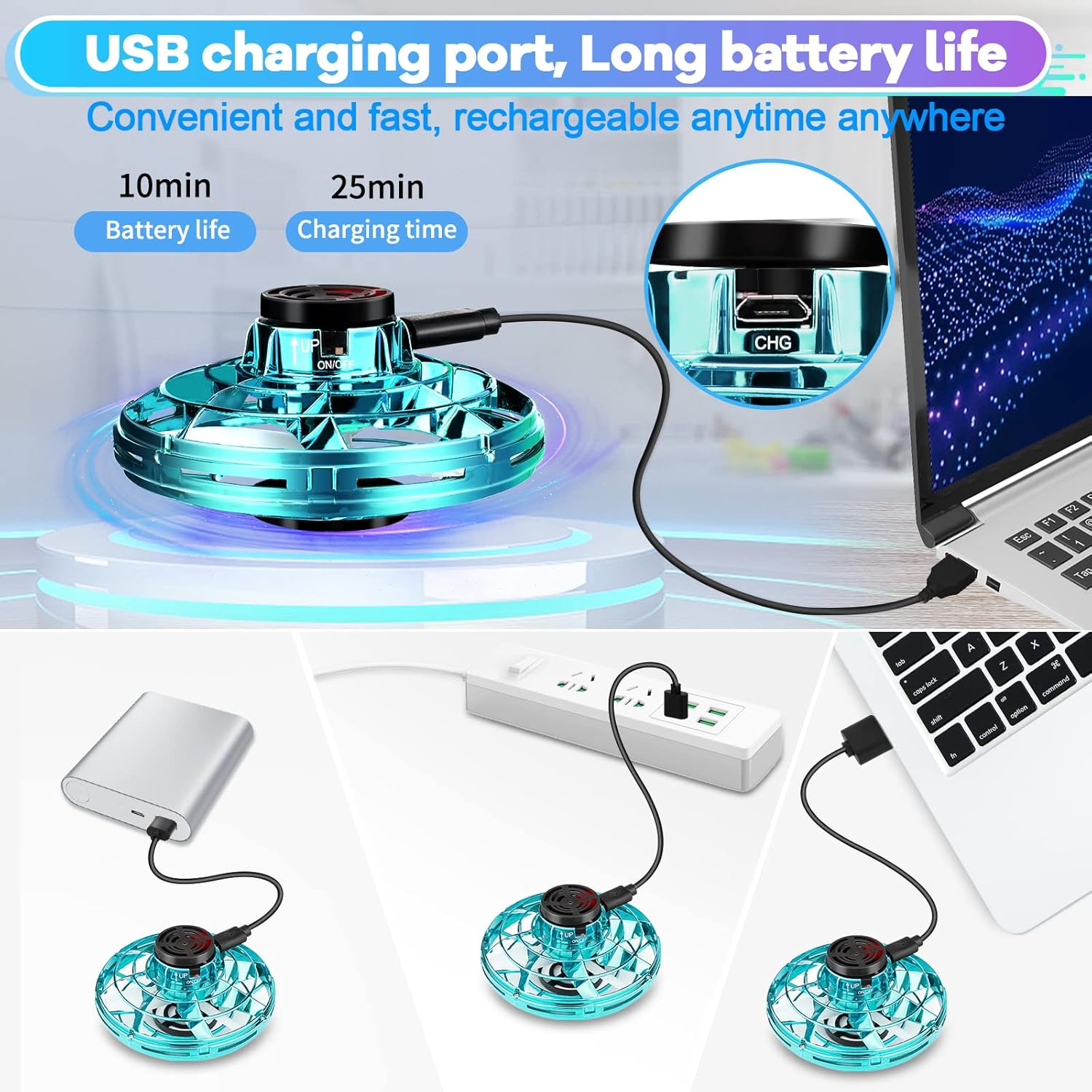 - USB Rechargeable & Portable Design:Mini drone for kids is USB rechargeable and supports various charging methods such as computers,power adapters,and rechargeable batteries.It only takes 30 minutes to charge,you can enjoy the fun of cool toys.The indicator light stays on when charging,and it goes out when charging is complete.The flying toys can be easily carried wherever you go without taking up a lot of space.So this kids UFO drone toy is the perfect flying toy